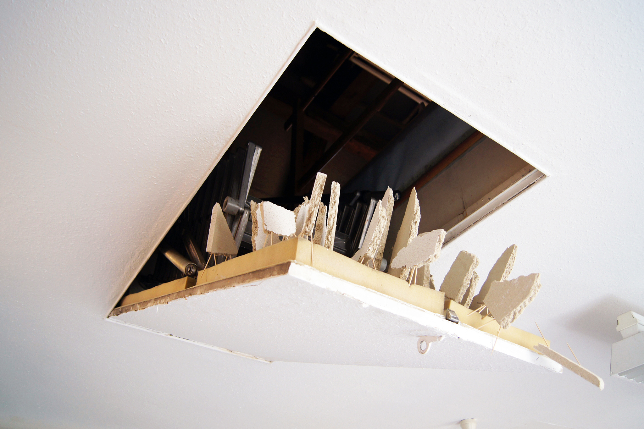 Alle sind gegangen, das Haus macht das jetzt auch. Gipskartonplatten - Material des Gebäudes, machen sich auf den Weg.